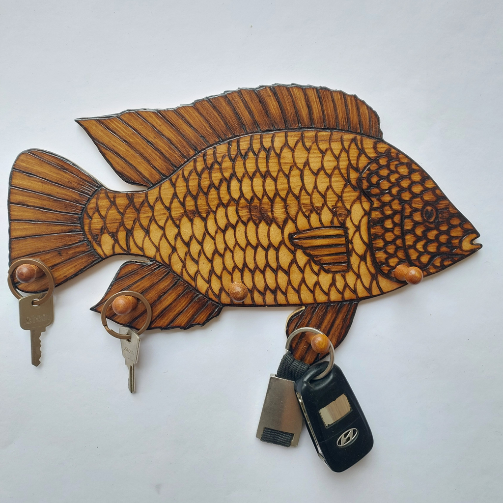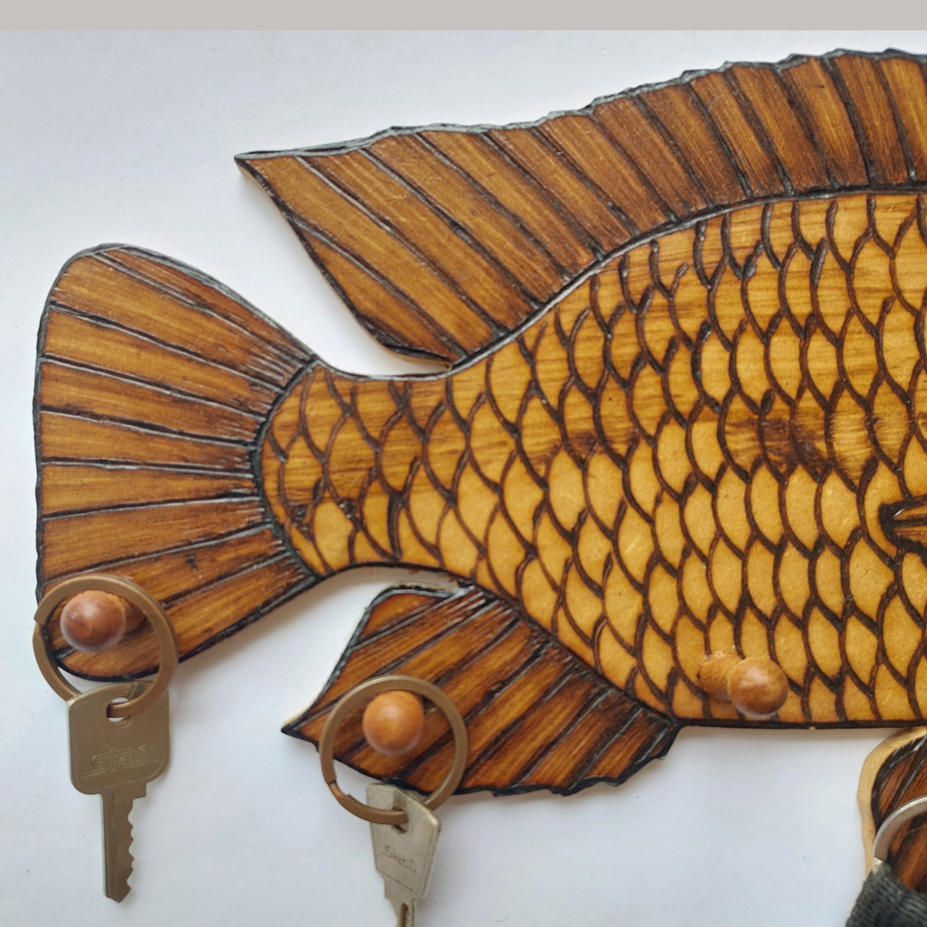 O Porta-Chaves é uma peça artesanal feita em chapas de madeira natural, com acabamento feito à mão e detalhes em pirógrafo, que realçam o formato e as cores do peixe.