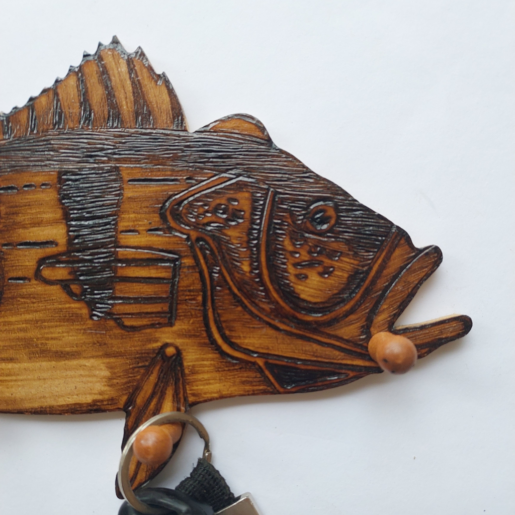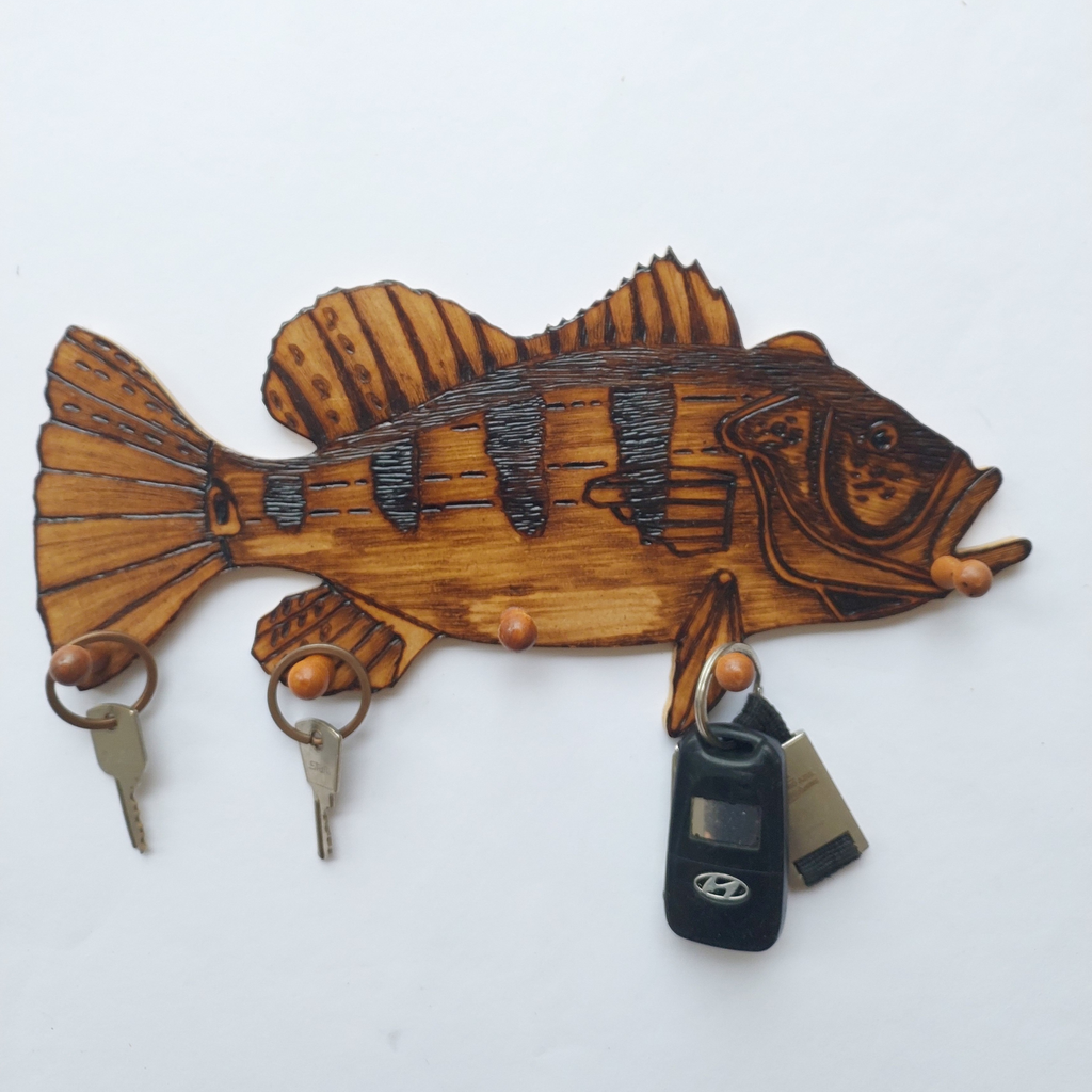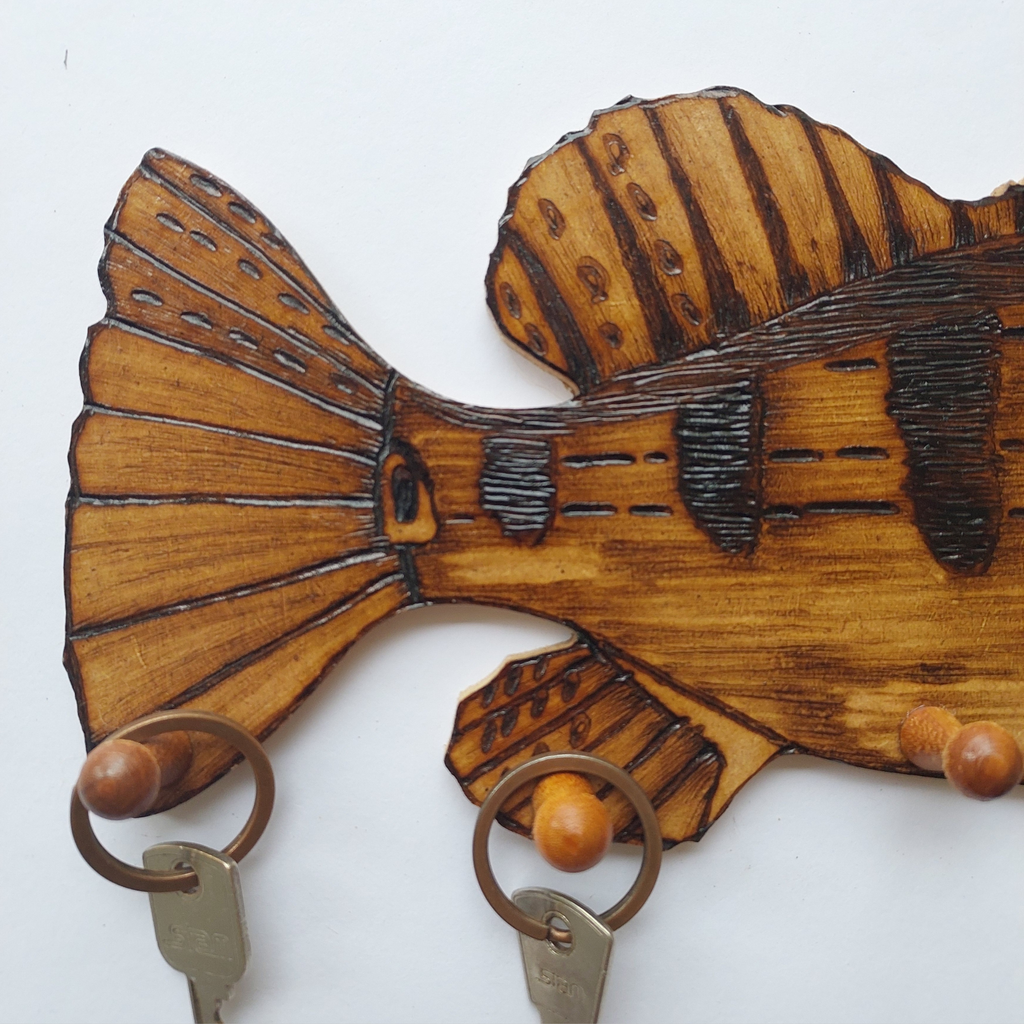 O Porta-Chaves é uma peça artesanal feita em chapas de madeira natural, com acabamento feito à mão e detalhes em pirógrafo, que realçam o formato e as cores do peixe.
