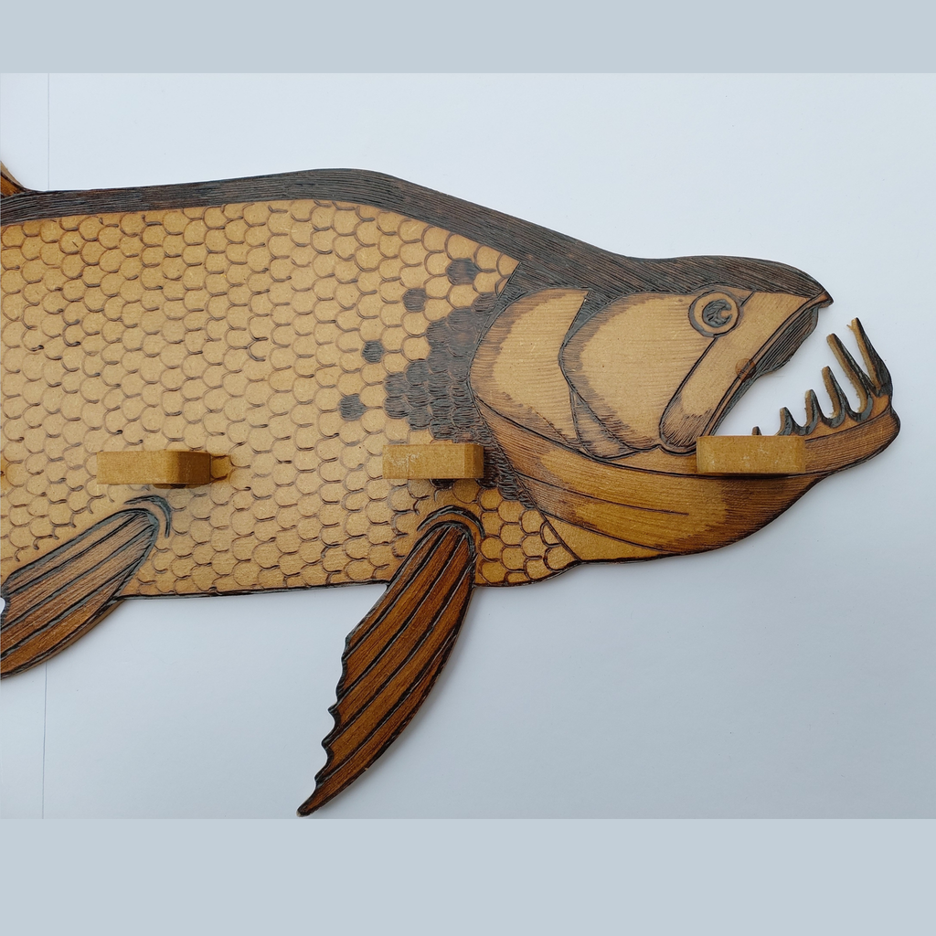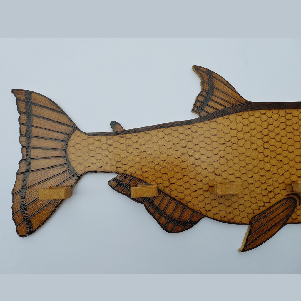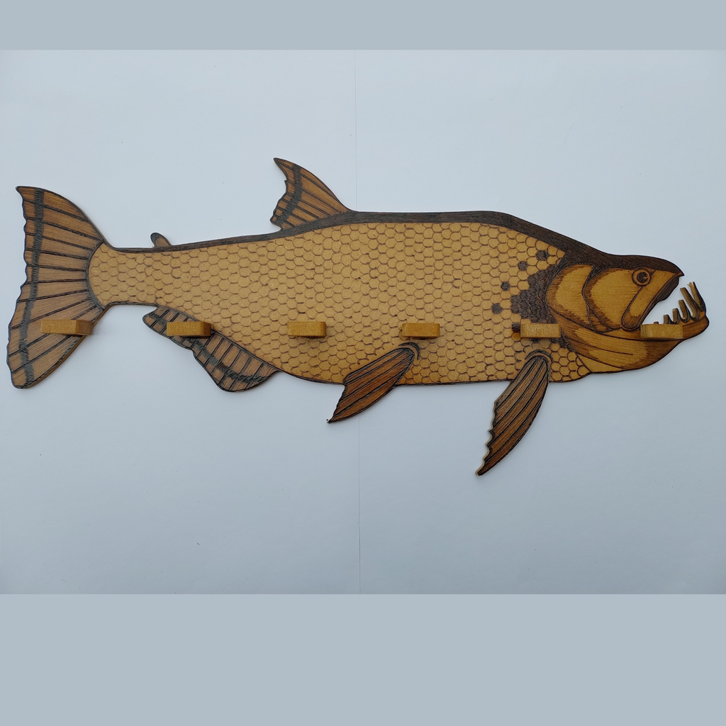 O modelo Cachorra tem design robusto e acabamento artesanal em chapas de madeira de pinheiro, semelhante ao MDF, porém muito mais resistente, pensado para quem valoriza organização e estilo no ambiente de pesca ou lazer.